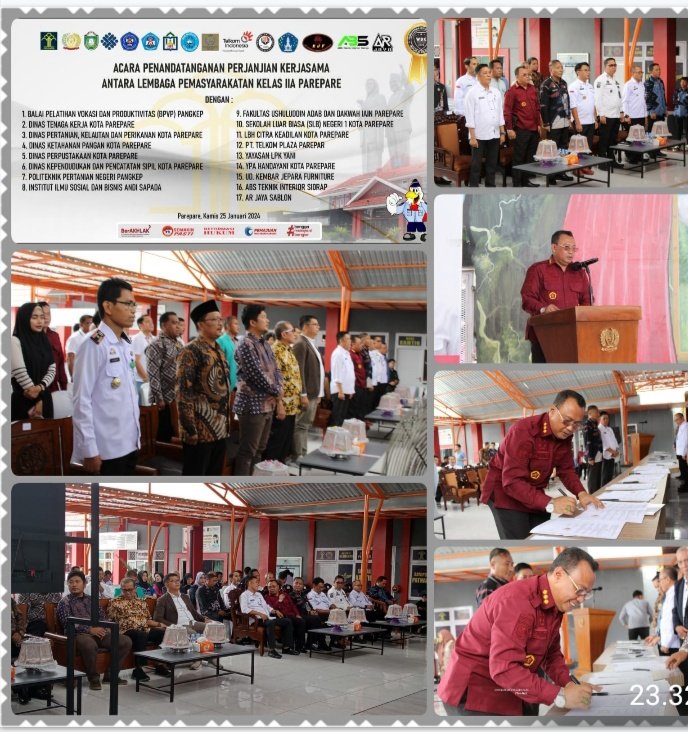 kosongsatunews.com, PAREPARE–Bertempat di Lapas IIA Parepare mulai pukul 10.00 Wita, telah dilaksanakan kegiatan penandatanganan Perjanjian Kerja Sama dengan 18 stakeholder mulai dari lembaga pemerintahan, pendidikan, BUMN hingga IKM dan pelaku usaha lainnya dalam rangka percepatan penyelenggaraan pemasyarakatan yaitu untuk mempercepat pelaksanaan implementasi akuntabilitas kinerja organisasi dan kinerja anggaran, dan pelaksanaan reformasi birokrasi serta meningkatkan kualitas dukungan manajemen, pembentukan regulasi, pelayanan dan penegakan hukum, serta pemajuan dan penegakan HAM sesuai Rencana Strategis (Renstra) serta mendorong tercapainya program prioritas. Kamis, 25 Januari 2024.
