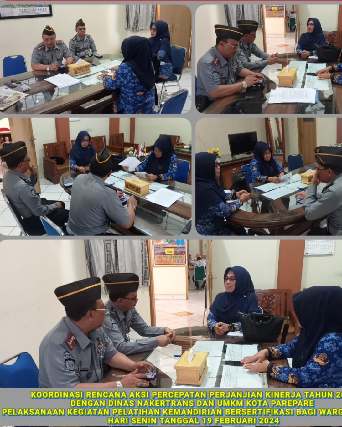 Sementara dikesempatan lain bertempat di Dinas Nakertrans Dan UMKM Kota Parepare Kepala Lapas IIA Parepare didampingi Kepala Seksi Kegitan Kerja Abdullah, S.Pd, M.Si dan Fathur Rahman, SH melakukan rapat koordinasi membahas rencana kegiatan Pembukaan Pelatihan Kemandirian Bersertifikasi Bagi Warga Binaan LAPAS IIA Parepare. Pelatihan Kemandirian Bersertifikat bagi Warga Binaan yang disediakan oleh Direktorat Jenderal Pemasyarakatan ada 4 (Empat) paket kegiatan. Setiap paket kegiatan pelatihan kemandirian bersertifikasi berjumlah 10 orang berdasarkan DIPA SATKER LAPAS IIA PAREPARE TAHUN 2024. Kegiatan Pembukaan Pelatihan Kemandirian Bersertifikasi Bagi Warga Binaan LAPAS IIA Parepare akan dilaksanakan pada hari Selasa tanggal 20 Februari 2024 bekerja sama dengan :