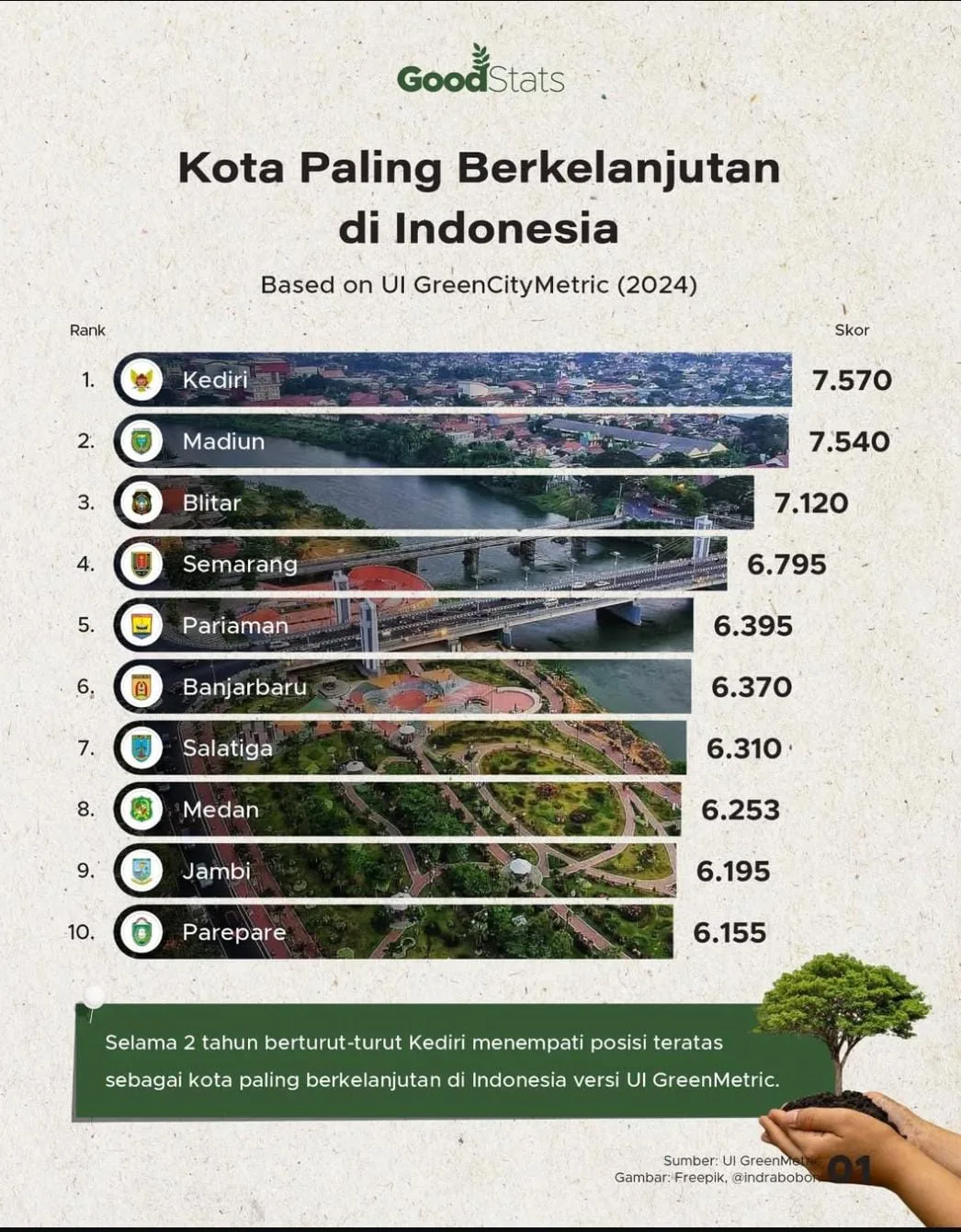 Lembaga pemeringkatan Universitas Indonesia (UI) GreenMetric kembali merilis daftar 10 kabupaten/kota paling berkelanjutan di Indonesia melalui UI GreenCityMetric Rankings 2024. Kota Parepare masuk dalam deretan 10 besar.