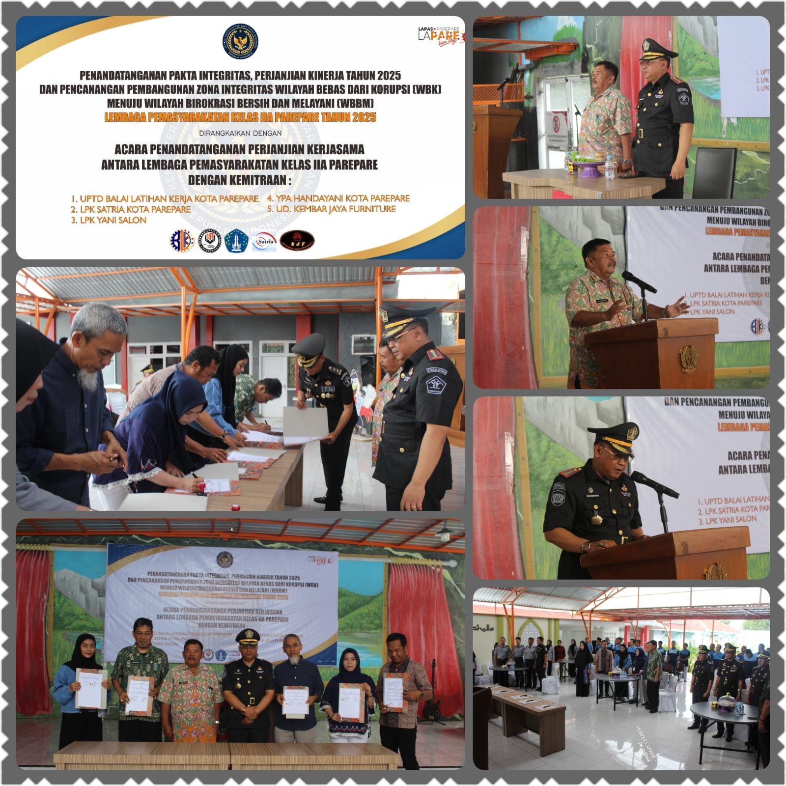 Parepare, 23 Januari 2025. Lembaga Pemasyarakatan (Lapas) Kelas IIA Parepare kembali menunjukkan komitmennya untuk meningkatkan tata kelola pemerintahan yang bersih dan transparan melalui Penandatanganan Komitmen Bersama dan Pakta Integritas Tahun 2025. Kegiatan ini juga dirangkaikan dengan penandatanganan Perjanjian Kerja Sama (PKS) dengan lima stakeholder kemitraan strategis : Balai Latihan Kerja Kota Parepare, LPK Satria Kota Parepare, LPK Yani Salon, YPA Handayani Kota Parepare, dan UD Kembar Jaya Furniture. Kamis (23/1).