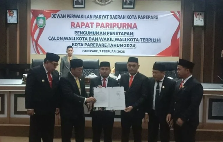 Parepare — DPRD Kota Parepare resmi mengumumkan penetapan Tasming Hamid dan Hermanto sebagai Pasangan Wali Kota dan Wakil Wali Kota Parepare terpilih periode 2025-2030 dalam rapat paripurna yang berlangsung di ruang sidang DPRD Parepare, Jumat (7/2/2025).