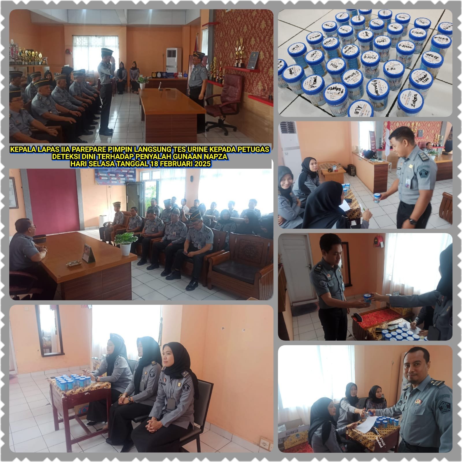PAREPARE, — Lembaga Pemasyarakatan (Lapas) Kelas IIA Parepare, Sulsel laksanakan tes urine bagi petugas diruang Kepala Lapas, Selasa, 18 Februari 2025