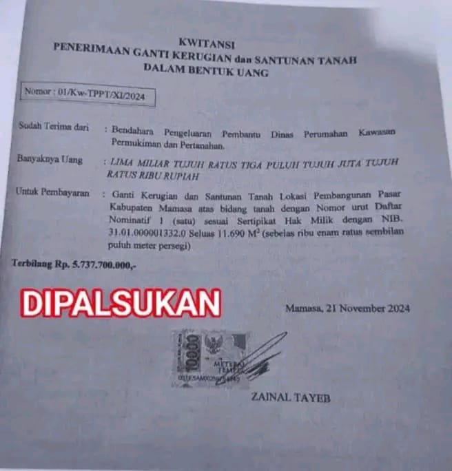 MAMASA — Pembayaran ganti rugi pengadaan tanah untuk pembangunan Pasar Kabupaten Mamasa kembali menjadi sorotan publik. Proyek pengadaan tanah seluas 11.690 meter persegi yang terletak di Desa Buntu Buda, Kecamatan Mamasa, Kabupaten Mamasa, menuai polemik menyusul adanya perbedaan data nominal anggaran.