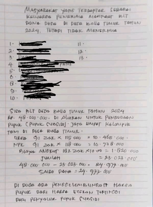 Seorang narasumber yang enggan disebutkan namanya menyatakan bahwa dirinya telah masuk dalam pendataan penerima BLT, namun tak pernah menerima bantuan tersebut. “Bukan hanya saya, beberapa warga lain mengalami hal serupa,” ungkapnya. Ironisnya, menurut informasi yang diterimanya, sisa dana BLT senilai Rp48 juta justru dialihkan ke pengadaan pupuk subsidi bagi empat kelompok tani.