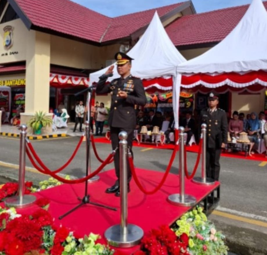 Kapolres Bantaeng, AKBP Nur Prasetyantoro Wira Utomo bertindak sebagai inspektur upacara dalam peringatan yang mengusung tema “Polri untuk Masyarakat”.