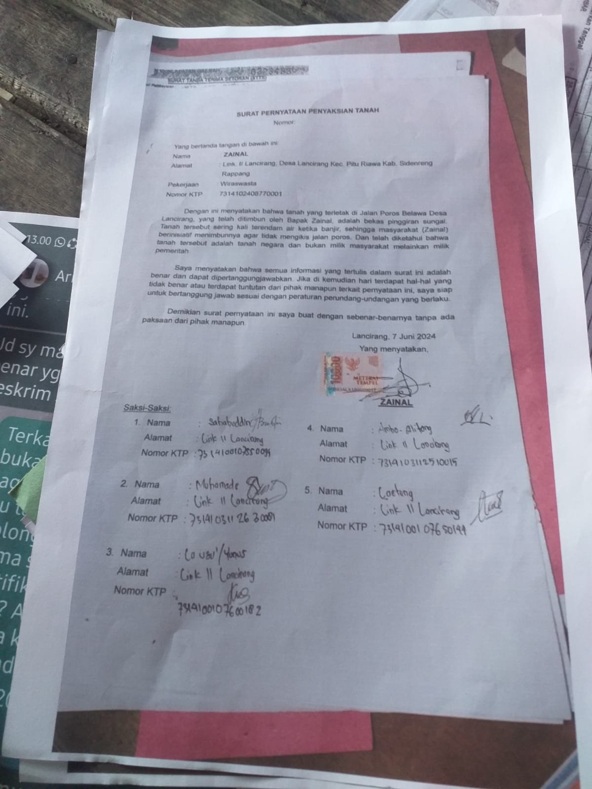 Salah satunya adalah kasus sertifikat tanah milik Ari (inisial), seorang pegawai Dinas Pertanian Kabupaten Sidrap. Sertifikat tersebut diterbitkan di atas lahan negara yang sejak 2011 dikuasai oleh Zainal, terletak di samping rumahnya, dan berbatasan langsung dengan lahan milik H. Karabi. Luas tanah tersebut diperkirakan sekitar 290 meter persegi dan berada di poros Lancirang – Belawa.