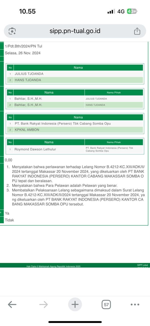 Proses Lelang BRI Somba Opu Cabang Makassar diduga Cacat Prosedur, Pihak Debitur Menang Atas Putusan Pengadilan Negeri Tual