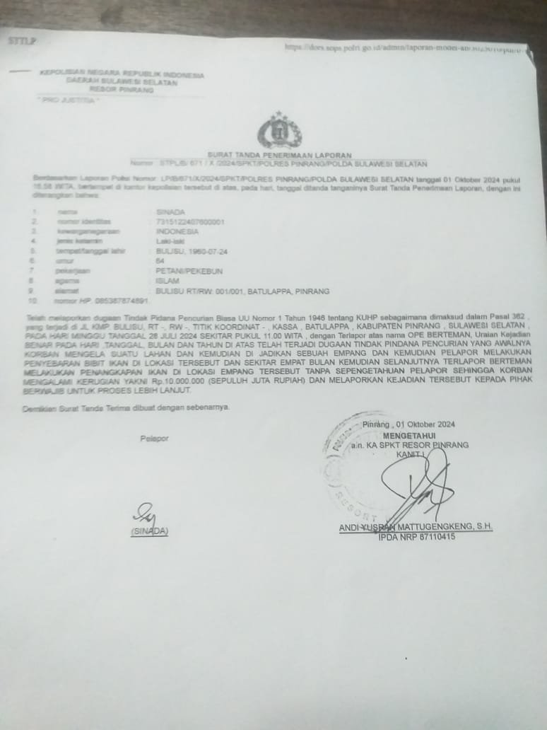 Lahan seluas 1.035 are yang dikuasai leluhurnya sejak tahun 1930-an kini menjadi Cekdam (tempat penampungan air) yang dijadikan tempat pemeliharaan ikan oleh almarhum Palemmai. Namun, menurut pengakuan Sinada, sudah 11 kali ikannya dijarah oleh oknum-oknum tertentu. Ia bahkan telah melaporkannya dua kali ke Polres Pinrang pertama pada 1 Oktober 2024 dan terakhir pada 17 Juli 2025 namun belum mendapat tanggapan.