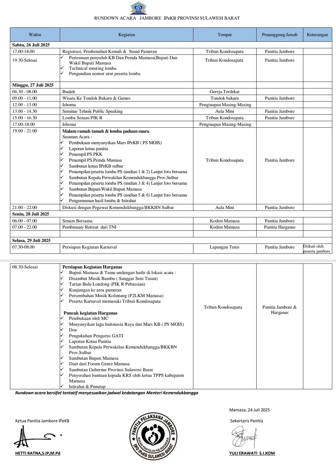 untuk diketahui rangkaian kegiatan Jambore dimulai Sabtu petang dengan registrasi peserta, pembenahan kemah, dan technical meeting lomba. Malam harinya, penyuluh KB dari berbagai kabupaten akan bertemu langsung dengan Bupati dan Wakil Bupati Mamasa.