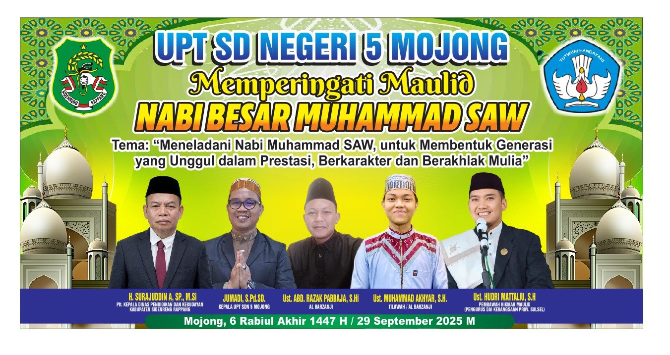 KOSONGSATUNEWS.COM, SIDRAP, – UPT SDN 5 Mojong menggelar Peringatan Maulid Nabi Muhammad SAW 1446 H/2025 M pada Senin (29/9/2025). Kegiatan berlangsung khidmat, dihadiri oleh perwakilan Dinas Pendidikan, pemerintah kecamatan dan desa, tokoh masyarakat, komite sekolah, guru, orang tua, serta seluruh siswa.