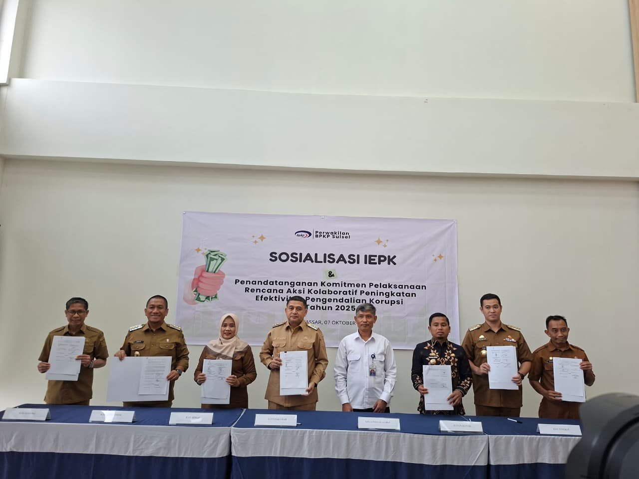 Komitmen itu ditegaskan melalui Penandatanganan Komitmen Pelaksanaan Rencana Aksi Kolaboratif Pengendalian Korupsi Tahun 2025 yang dirangkaikan dengan Sosialisasi Indeks Efektivitas Pengendalian Korupsi (IEPK), Selasa (7/10/2025) di Kantor BPKP Sulawesi Selatan, Makassar.