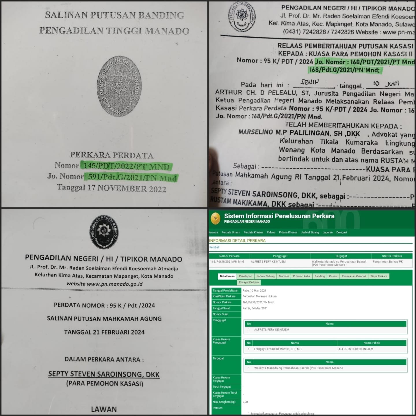 Dengan Fakta tersebut semakin kuat dugaan ada permainan Mafia Peradilan, yang melibatkan Panitera PN Manado dan Walikota Manado Andrei Angouw Dkk, yang dengan sengaja mengubah dan memalsukan Nomor Perkara yang di sidangkan. Serta merubah Cover Putusan Kasasi Mahkamah Agung. Yang seharusnya sesuai Putusan Kasasi Mahkamah Agung nomor 95 K/PDT/2024 Antara Septy Steven Saroinsong melawan Walikota Andrei Angouw Dkk, tetapi di rubah oleh Panitera Menjadi Septy Steven Saroinsong melawan Rustam Makikam, Padahal Rustam Makikama adalah teman Penggugat Intervensi.