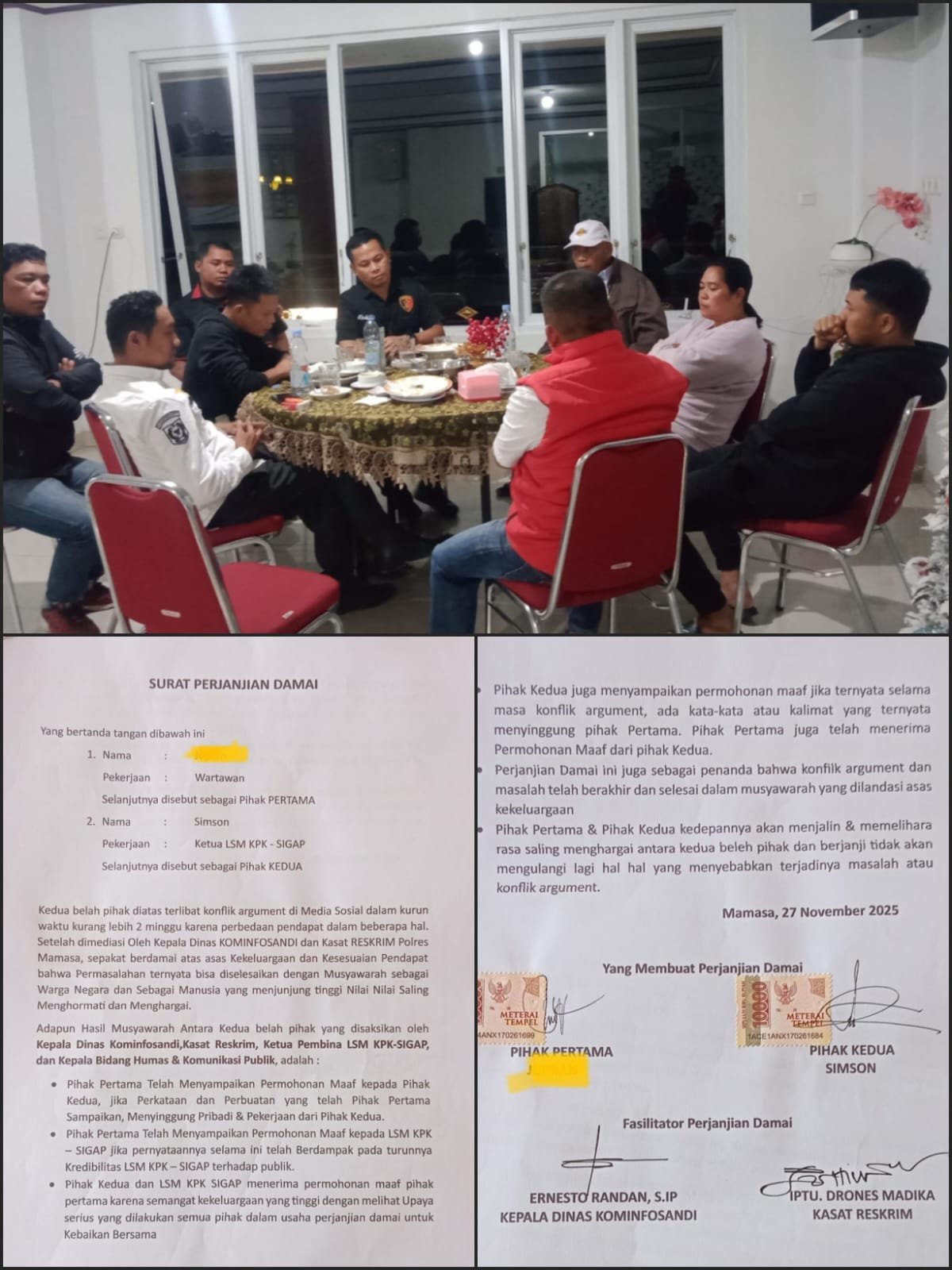 MAMASA — Konflik antara salah satu oknum dengan Simson dan lembaga KPK Sigap Mamasa resmi berakhir damai setelah dilakukan mediasi kekeluargaan pada Jumat, 28 November 2025. Penyelesaian tersebut turut difasilitasi oleh Kasat Reskrim Polres Mamasa, IPTU Drones Ma’dika, dan Kepala Dinas Kominfosandi Mamasa, Ernesto Randa, S.IP, yang baru beberapa hari menjabat namun langsung menunjukkan peran penting dalam meredam ketegangan antara insan pers dan lembaga swadaya masyarakat.