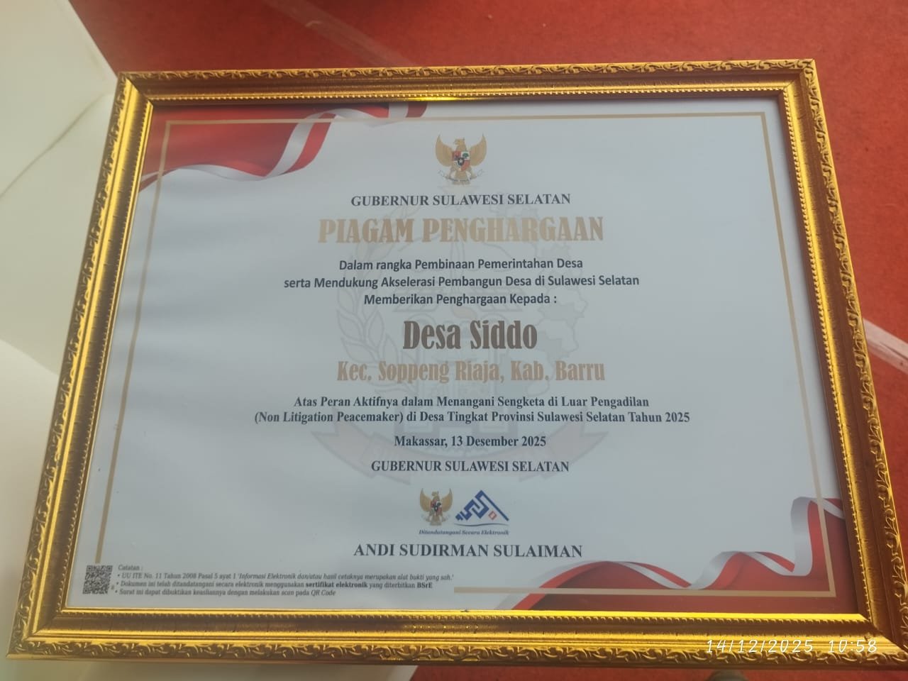 Pada kegiatan tersebut, Desa Siddo menerima apresiasi dari Gubernur Sulawesi Selatan berupa Sertifikat Penghargaan atas perannya dalam penanganan sengketa di luar pengadilan (Non Litigation Peacemaker) tingkat Provinsi Sulawesi Selatan.