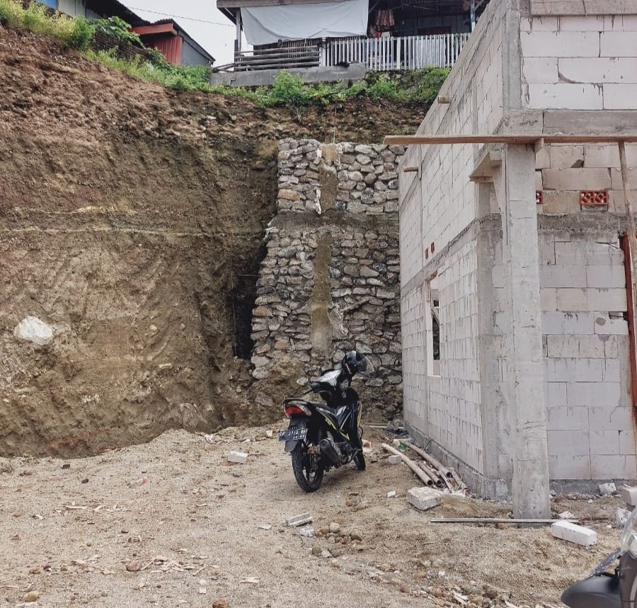 “Air akan masuk di sela-selanya, akhirnya rentan runtuh. Kalau runtuh, karena jarak rumah tidak sampai 1 meter dari dinding, berpotensi langsung menimpa rumah,” jelas Sofyan.