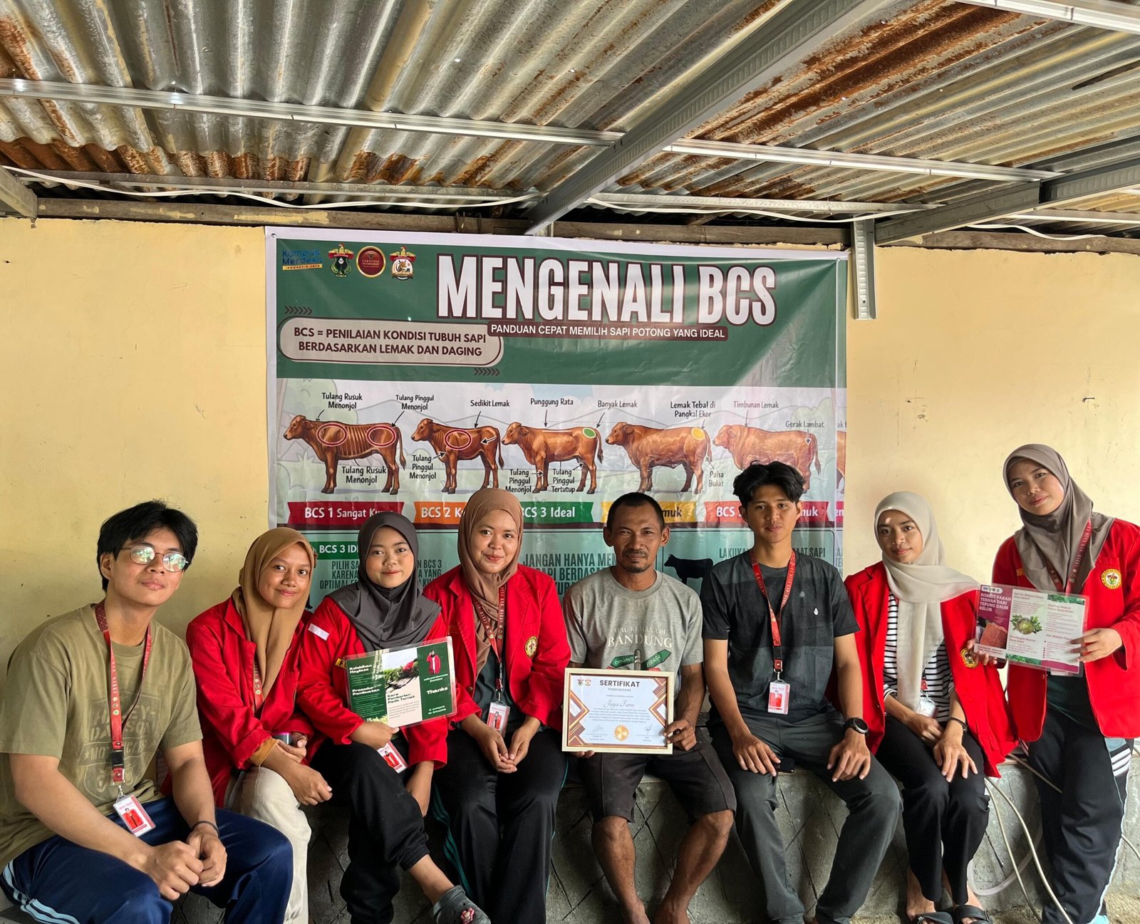 Sebelum pemasangan, mahasiswa memberikan penjelasan singkat kepada peternak mengenai pentingnya BCS. Metode ini digunakan untuk menilai cadangan lemak tubuh ternak yang berkaitan erat dengan kecukupan nutrisi, kesehatan, serta performa produksi dan reproduksi.