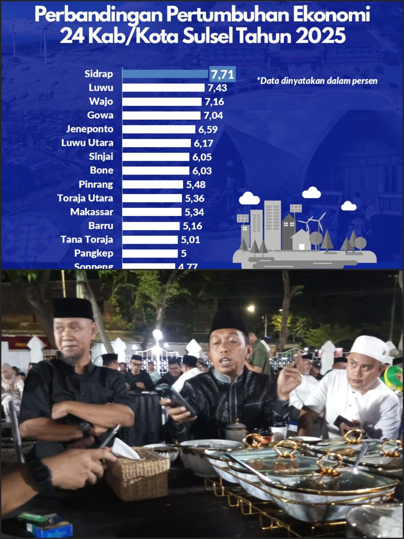KOSONGSATUNEWS.COM, SIDRAP, – Kabupaten Sidenreng Rappang mencatatkan capaian gemilang dalam pertumbuhan ekonomi tahun 2025. Berdasarkan data Badan Pusat Statistik (BPS), Sidrap menorehkan pertumbuhan ekonomi sebesar 7,71 persen, tertinggi di Sulawesi Selatan dari 24 kabupaten/kota.