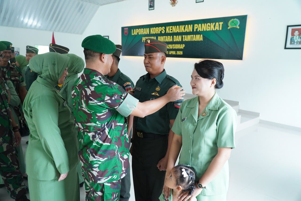 Sebanyak 11 personel Kodim 1420/Sidrap resmi menerima kenaikan pangkat dalam kegiatan Korps Raport Perwira, Bintara dan Tamtama periode 1 April 2026.