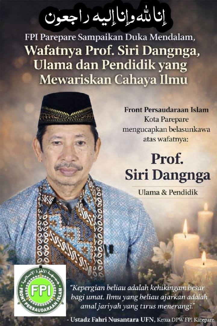 Ketua DPW FPI Kota Parepare, Ustadz Fahri Nusantara (UFN), menyampaikan bahwa Prof. Siri Dangnga adalah sosok langka yang tidak hanya menguasai ilmu, tetapi juga menghidupkannya dalam amal dan perjuangan nyata.