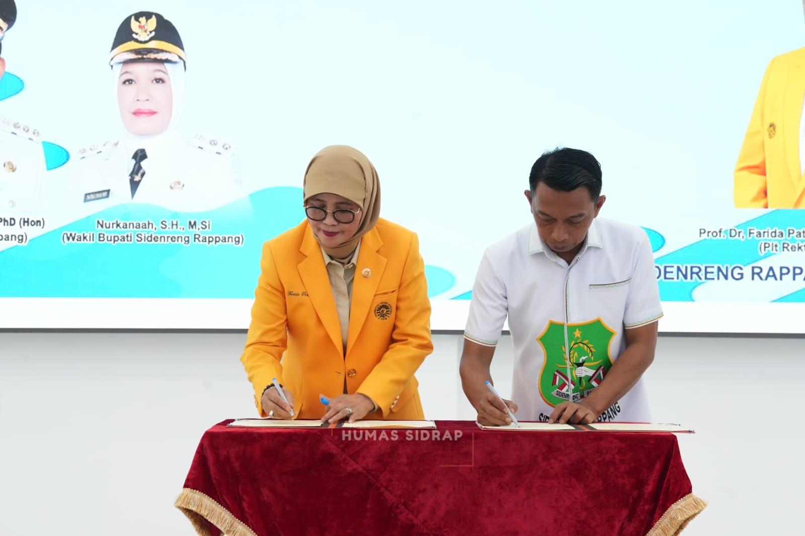 Prosesi penandatanganan berlangsung di Aula Saromase, Kompleks SKPD Sidrap, dilakukan langsung Bupati Sidrap, Syaharuddin Alrif, bersama Pelaksana Tugas (Plt.) Rektor UNM, Prof. Dr. Farida Patittingi, dan Dekan Fakultas Seni dan Desain UNM, Andi Ihsan.