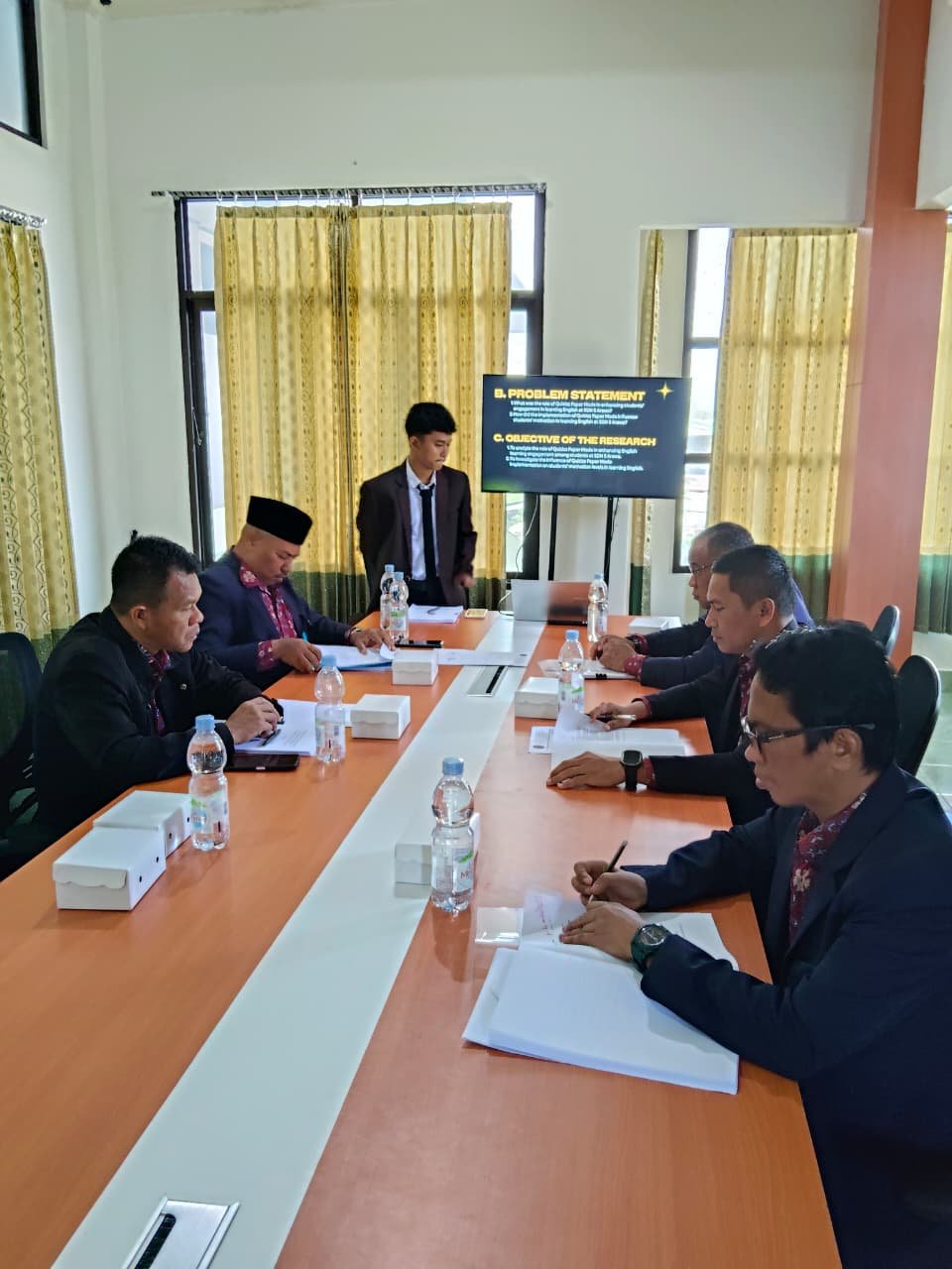 Kegiatan yang berlangsung di Ruang Ujian B07 tersebut menghadirkan mahasiswa Ardiansyah Putra yang mempresentasikan penelitian berjudul “An Analysis of the Role of Quizizz Paper Mode in Enhancing Students’ English Learning Engagement and Motivation at SDN 5 Arawa.”